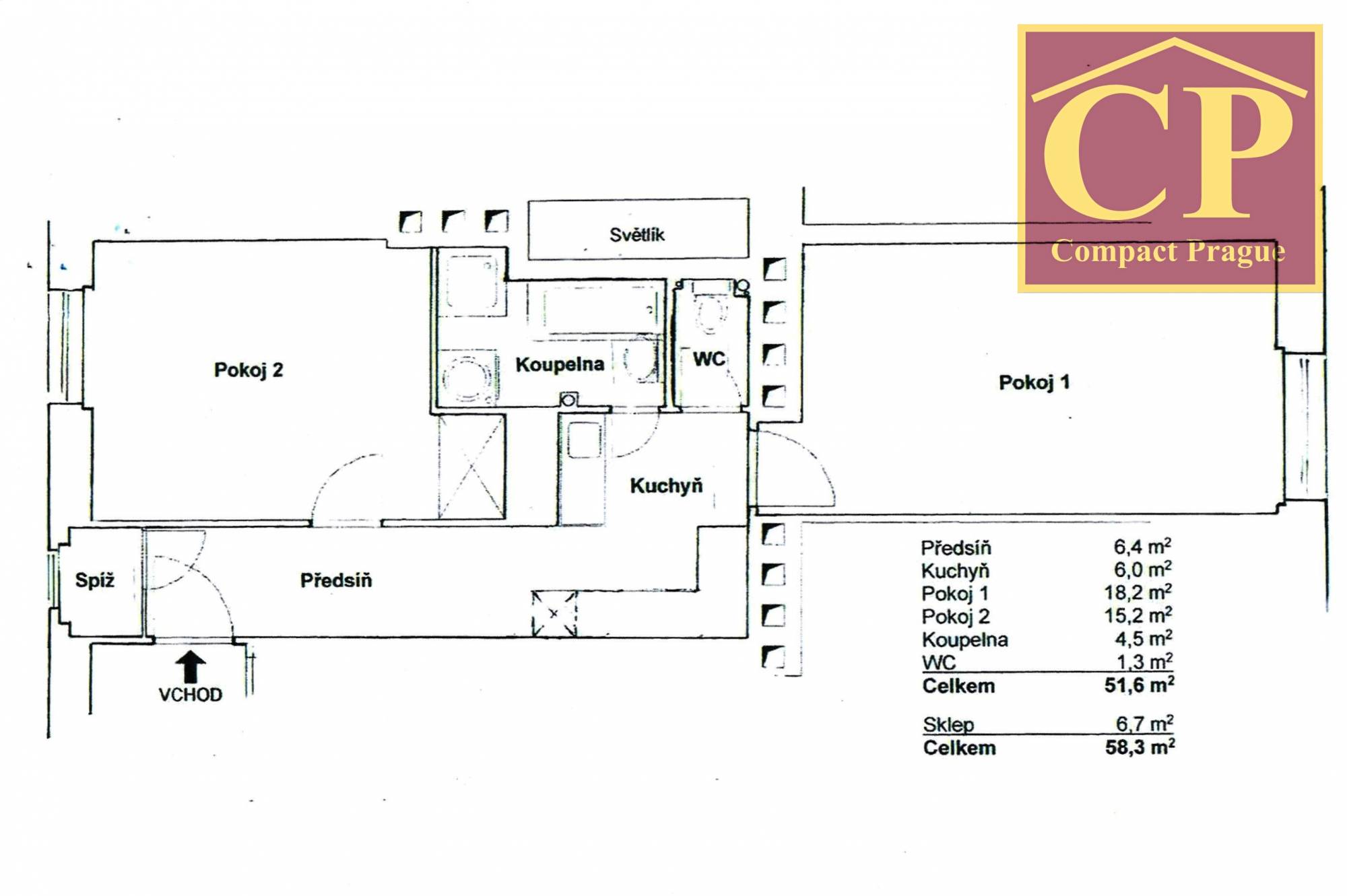 Byt disponuje podlahovou plochou 58 m², což nabízí dostatek prostoru pro komfortní bydlení. K bytu náleží také komora a praktický sklep o ploše cca 2 m², což poskytuje další úložné možnosti.